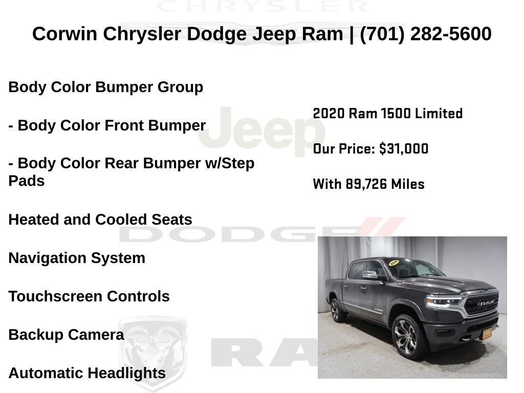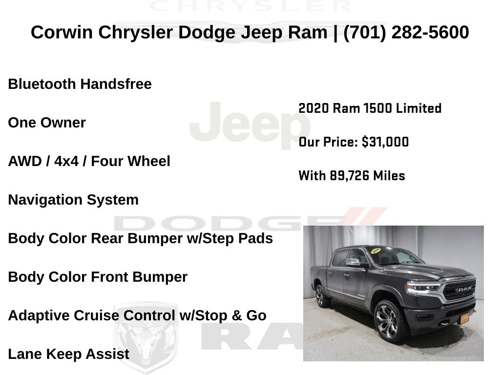 HAPPY JANUARY FROM CORWIN CHRYSLER DODGE JEEP RAM OF FARGO!! WE HAVE SAVINGS ON ALL OF OUR PRE-OWNED VEHICLES AVAILABLE!! WE HAVE ONE OF THE LARGEST SELECTIONS OF INVENTORIES IN OUR AREA AT ONE SINGLE LOCATION!! Granite Crystal Metallic Clearcoat 2020 Ram 1500 Limited FACTORY CERTIFIED 4D Crew Cab 4WD EcoDiesel 3.0L V6 Certified. CARFAX One-Owner. Clean CARFAX.