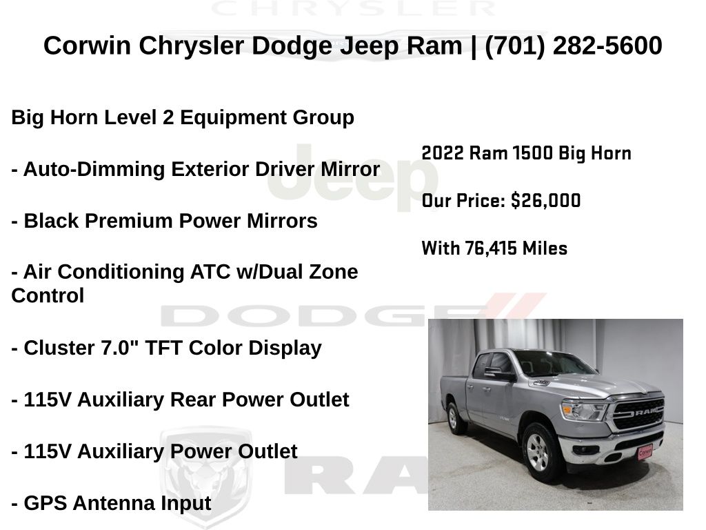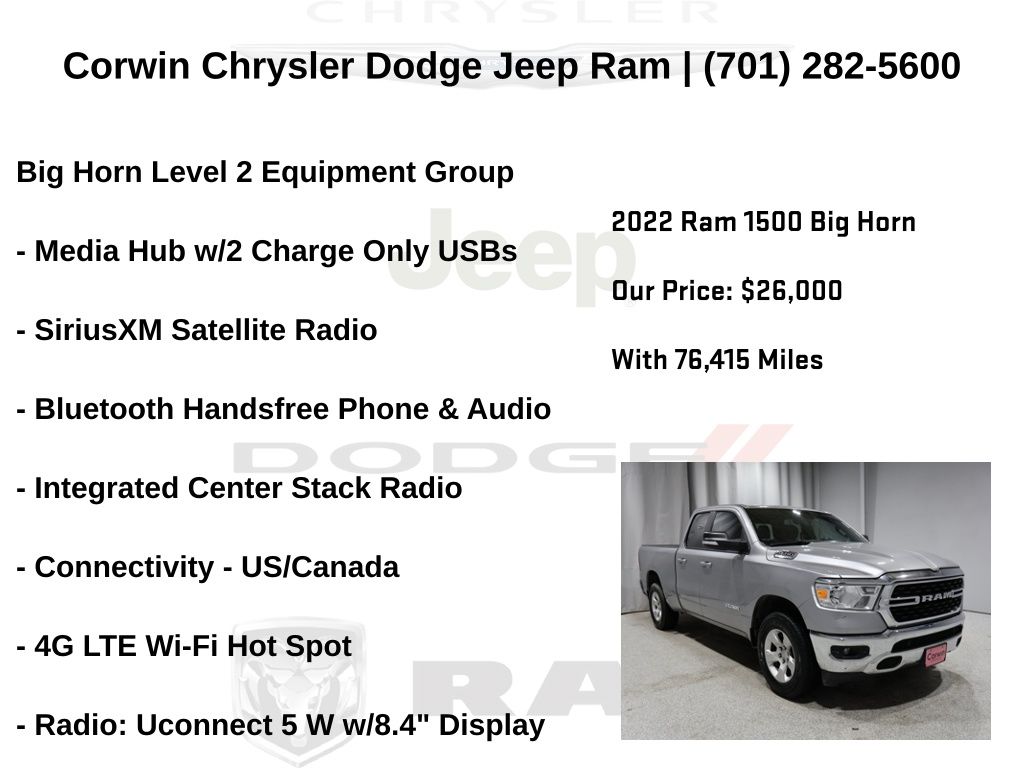 WELCOME TO DECEMBER AT CORWIN CHRYSLER DODGE JEEP RAM OF FARGO!! WE HAVE GREAT SAVINGS ON ALL OF OUR PRE-OWNED VEHICLES AVAILABLE!! WE HAVE ONE OF THE LARGEST SELECTIONS OF INVENTORIES IN OUR AREA AT ONE SINGLE LOCATION!! Priced below KBB Fair Purchase Price! Billet Silver Metallic Clearcoat 2022 Ram 1500 Big Horn/Lone Star 4D Quad Cab 4WD 3.6L V6 24V VVT CARFAX One-Owner.