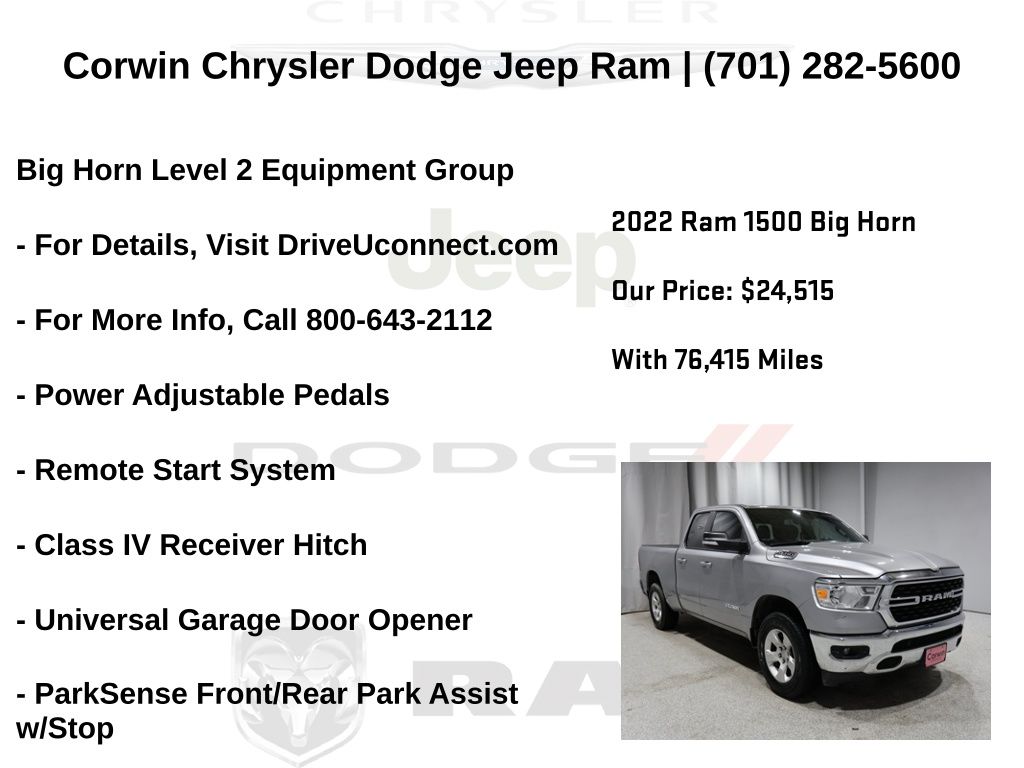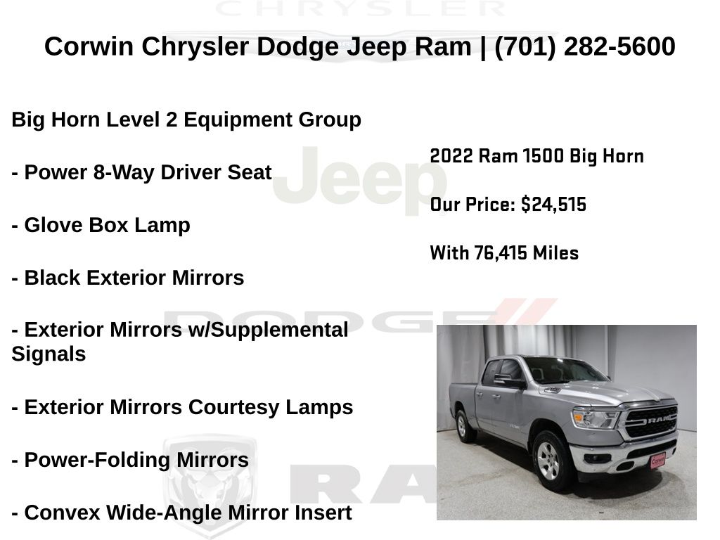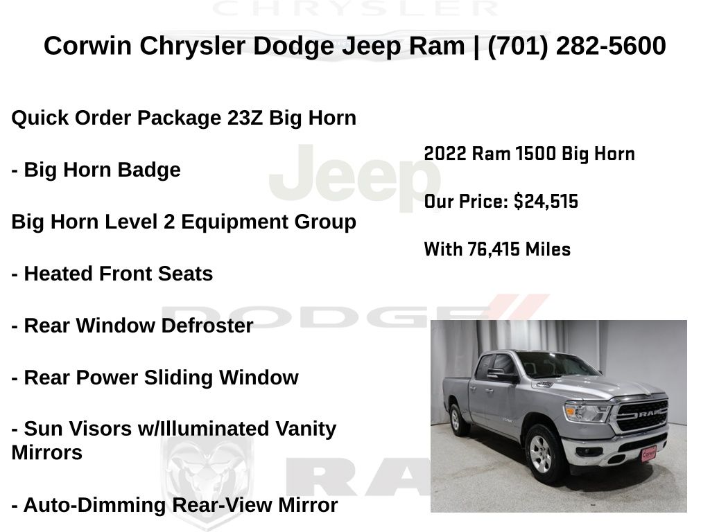 WELCOME TO DECEMBER AT CORWIN CHRYSLER DODGE JEEP RAM OF FARGO!! WE HAVE GREAT SAVINGS ON ALL OF OUR PRE-OWNED VEHICLES AVAILABLE!! WE HAVE ONE OF THE LARGEST SELECTION OF INVENTORIES IN OUR AREA AT ONE SINGLE LOCATION!! Priced below KBB Fair Purchase Price! Billet Silver Metallic Clearcoat 2022 Ram 1500 Big Horn/Lone Star 4D Quad Cab 4WD 3.6L V6 24V VVT CARFAX One-Owner. Clean CARFAX.