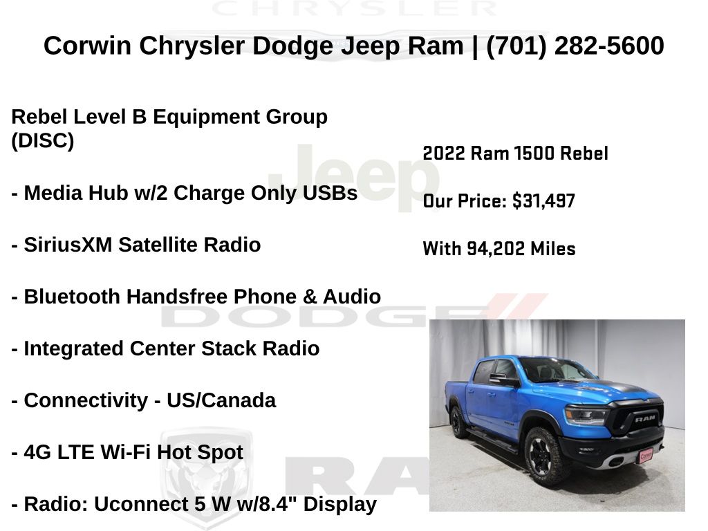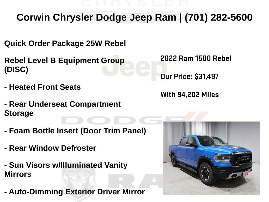 WELCOME TO DECEMBER AT CORWIN CHRYSLER DODGE JEEP RAM OF FARGO!! WE HAVE GREAT SAVINGS ON ALL OF OUR PRE-OWNED VEHICLES AVAILABLE!! WE HAVE ONE OF THE LARGEST SELECTION OF INVENTORIES IN OUR AREA AT ONE SINGLE LOCATION!! Priced below KBB Fair Purchase Price! Hydro Blue Pearlcoat 2022 Ram 1500 Rebel FACTORY CERTIFIED 4D Crew Cab 4WD HEMI 5.7L V8 Multi Displacement VVT Certified. CARFAX One-Owner. Clean CARFAX.