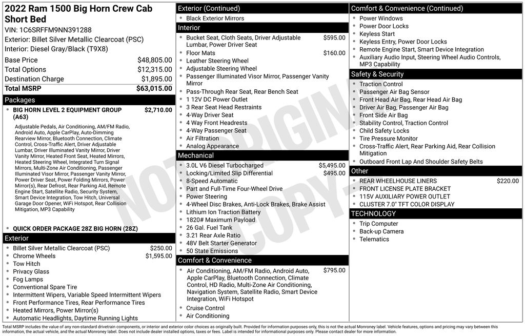 This Ram 1500 is well equipped and includes these key features and benefits, Heated Seats, Navigation System, Touchscreen Controls, Backup Camera, Automatic Headlights, Bluetooth Handsfree, AWD / 4x4 / Four Wheel, 115V Auxiliary Power Outlet, 115V Auxiliary Rear Power Outlet, 2nd Row In Floor Storage Bins, 4G LTE Wi-Fi Hot Spot, 8.4" Touchscreen Display, Air Conditioning ATC w/Dual Zone Control, Apple CarPlay, Auto-Dimming Exterior Driver Mirror, Auto-Dimming Rear-View Mirror, Big Horn Badge, Big Horn Level 2 Equipment Group, Black Exterior Mirrors, Black Premium Power Mirrors, Bluetooth Handsfree Phone & Audio, Class IV Receiver Hitch, Cluster 7.0" TFT Color Display, Connectivity - US/Canada, Convex Wide-Angle Mirror Insert, Exterior Mirrors Courtesy Lamps, Exterior Mirrors w/Heating Element, Exterior Mirrors w/Supplemental Signals, For Details, Visit DriveUconnect.com, Global Telematics Box Module (TBM), Glove Box Lamp, Google Android Auto, GPS Antenna Input, GPS Navigation, Heated Front Seats, Heated Steering Wheel, Integrated Center Stack Radio, Media Hub w/2 Charge Only USBs, ParkSense Front/Rear Park Assist w/Stop, Power 2-Way Driver Lumbar Adjust, Power 8-Way Driver Seat, Power Adjustable Pedals, Power-Folding Mirrors, Quick Order Package 28Z Big Horn, Radio: Uconnect 5 W w/8.4" Display, Rear Dome w/On/Off Switch Lamp, Rear Power Sliding Window, Rear Window Defroster, Remote Start System, Security Alarm, SiriusXM Radio Service, SiriusXM Satellite Radio, Sun Visors w/Illuminated Vanity Mirrors, Universal Garage Door Opener, USB Host Flip. 21/29 City/Highway MPG