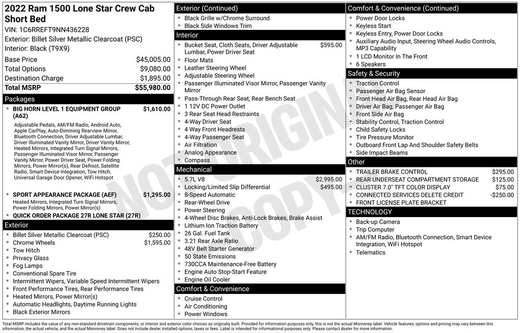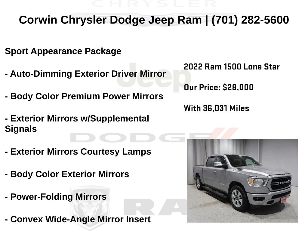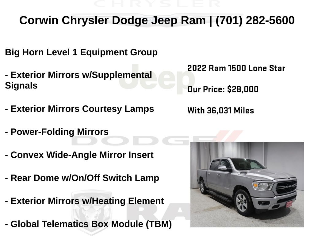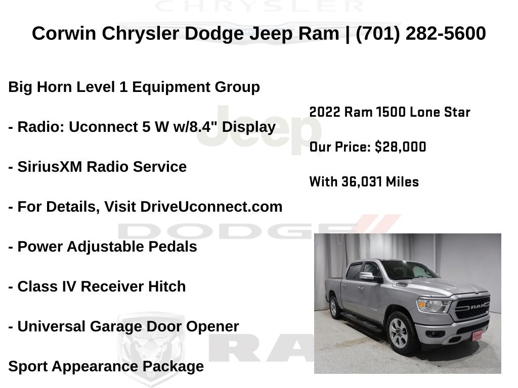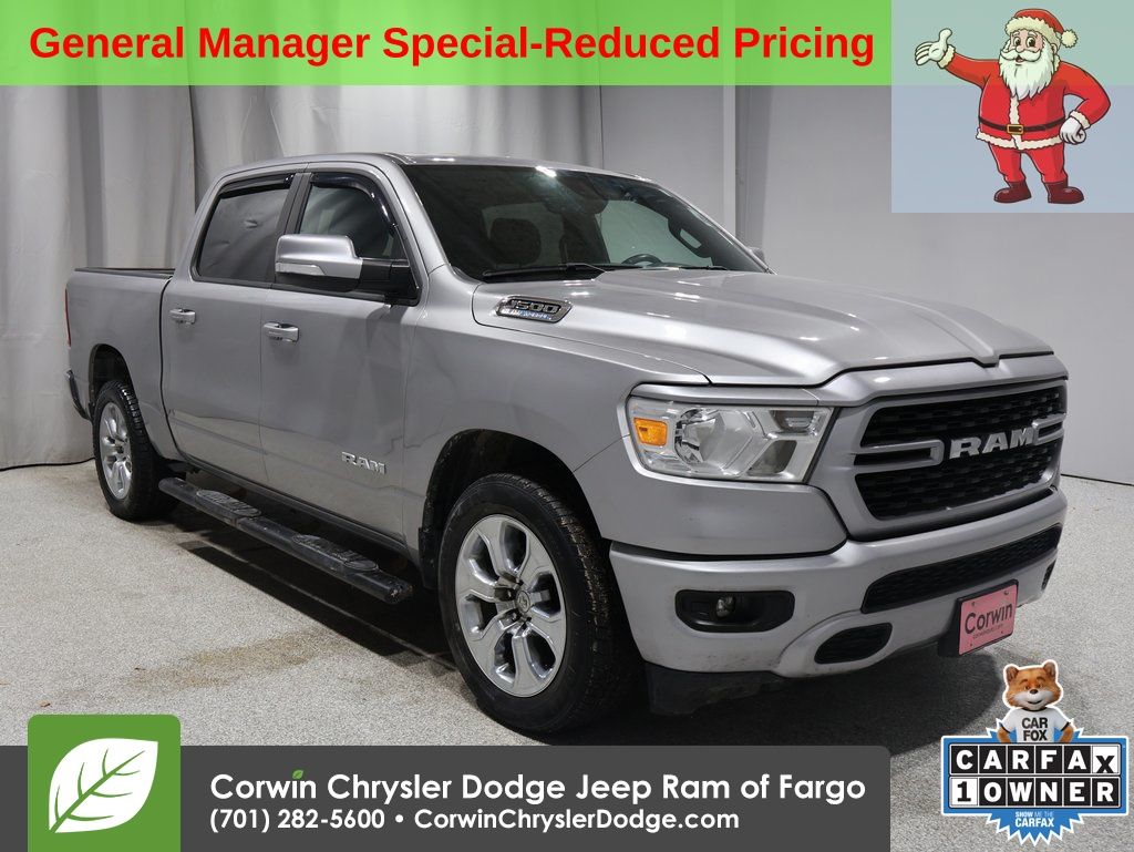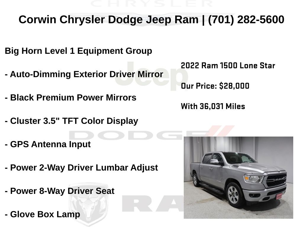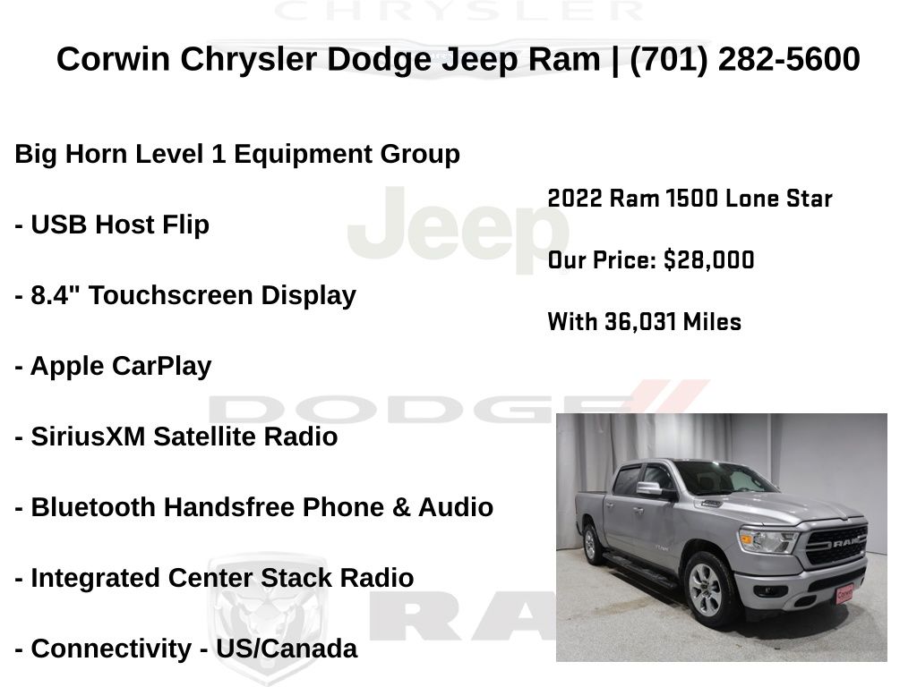 WELCOME TO DECEMBER AT CORWIN CHRYSLER DODGE JEEP RAM OF FARGO!! WE HAVE GREAT SAVINGS ON ALL OF OUR PRE-OWNED VEHICLES AVAILABLE!! WE HAVE ONE OF THE LARGEST SELECTIONS OF INVENTORIES IN OUR AREA AT ONE SINGLE LOCATION!! Priced below KBB Fair Purchase Price! Billet Silver Metallic Clearcoat 2022 Ram 1500 Big Horn/Lone Star 4D Crew Cab RWD HEMI 5.7L V8 Multi Displacement VVT CARFAX One-Owner. Clean CARFAX.