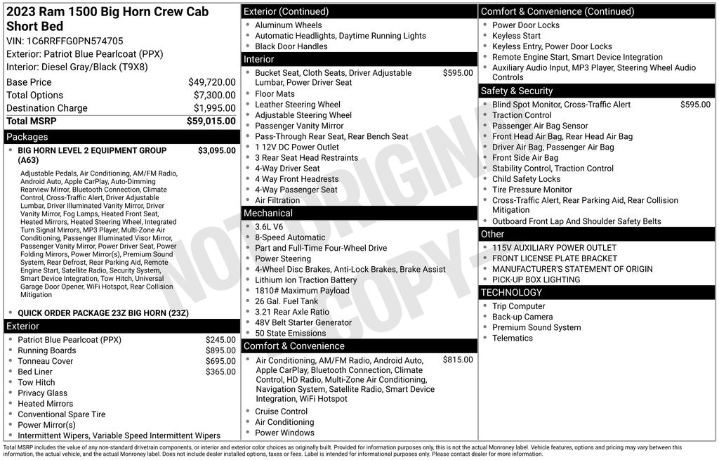 EMBRACE THE SHORTEST MONTH OF THE YEAR WITH CORWIN CHRYSLER DODGE JEEP RAM OF FARGO! WE HAVE SAVINGS ON ALL OF OUR PRE-OWNED VEHICLES AVAILABLE!!WE HAVE ONE OF THE LARGEST SELECTIONS OF INVENTORIES IN OUR AREA AT ONE SINGLE LOCATION!! Recent Arrival! Priced below KBB Fair Purchase Price! Patriot Blue Pearlcoat 2023 Ram 1500 Big Horn/Lone Star FACTORY CERTIFIED 4D Crew Cab 4WD 3.6L V6 24V VVT Certified. CARFAX One-Owner.