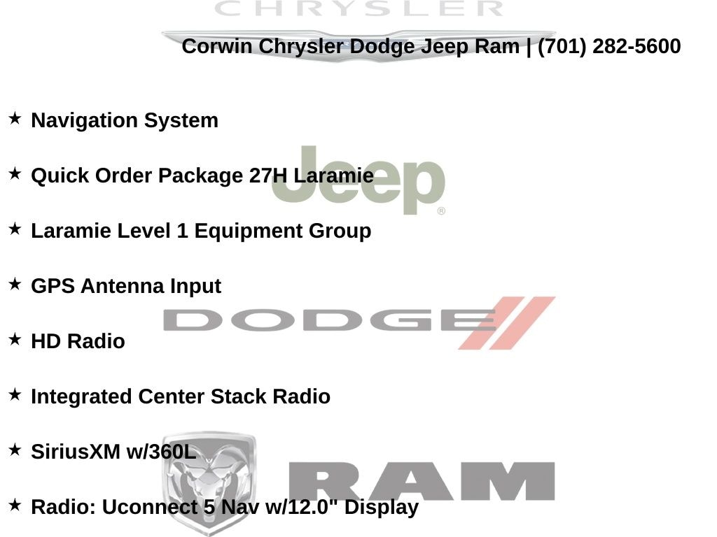 This Ram 1500 is well equipped and includes these key features and benefits, Heated and Cooled Seats, Navigation System, Touchscreen Controls, Backup Camera, Automatic Headlights, Bluetooth Handsfree, AWD / 4x4 / Four Wheel, 12" Touchscreen Display, 2nd Row In Floor Storage Bins, 4G LTE Wi-Fi Hot Spot, Apple CarPlay, Auto High Beam Headlamp Control, Blind Spot & Cross Path Detection, Connected Travel & Traffic Services, Connectivity - US/Canada, Disassociated Touchscreen Display, Electric Shift-On-Demand Transfer Case, Foam Bottle Insert (Door Trim Panel), For Details, Visit DriveUconnect.com, For More Info, Call 800-643-2112, Front Door Accent Lighting, Front LED Fog Lamps, Global Telematics Box Module (TBM), Google Android Auto, GPS Antenna Input, GPS Navigation, HD Radio, Heated front seats, Integrated Center Stack Radio, Integrated Voice Command w/Bluetooth, Laramie Level 1 Equipment Group, LED Reflector Headlamps, Navigation System, ParkSense Front/Rear Park Assist w/Stop, Quick Order Package 27H Laramie, Radio: Uconnect 5 Nav w/12.0" Display, Rain Sensitive Windshield Wipers, Rear Door Accent Lighting, Rear Power Sliding Window, Rear Window Defroster, Remote Tailgate Release, SiriusXM Radio Service, SiriusXM w/360L, USB Host Flip, Ventilated Front Seats.