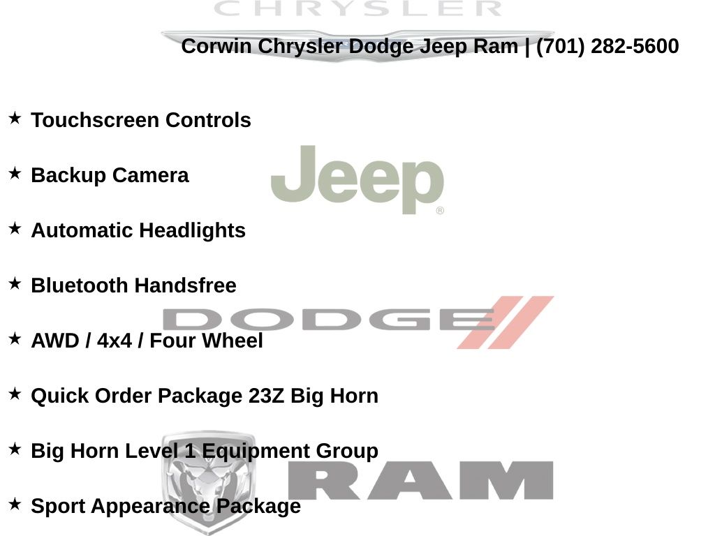 This Ram 1500 is well equipped and includes these key features and benefits, Touchscreen Controls, Backup Camera, Automatic Headlights, Bluetooth Handsfree, AWD / 4x4 / Four Wheel, 2nd Row In Floor Storage Bins, 4G LTE Wi-Fi Hot Spot, 8.4" Touchscreen Display, Apple CarPlay, Auto-Dimming Exterior Driver Mirror, Auto-Dimming Rear-View Mirror, Big Horn Badge, Big Horn Level 1 Equipment Group, Black Exterior Mirrors, Black Interior Accents, Black Premium Power Mirrors, Bluetooth Handsfree Phone & Audio, Body Color Door Handles, Body Color Exterior Mirrors, Body Color Front Bumper, Body Color Premium Power Mirrors, Body Color Rear Bumper w/Step Pads, Class IV Receiver Hitch, Connectivity - US/Canada, Convex Wide-Angle Exterior Mirror Insert, Deluxe Cloth Bucket Seats, Electric Shift-On-Demand Transfer Case, Exterior Mirrors Courtesy Lamps, Exterior Mirrors w/Heating Element, Exterior Mirrors w/Supplemental Signals, For Details, Visit DriveUconnect.com, For More Info, Call 800-643-2112, Front Fog Lamps, Glove Box Lamp, Google Android Auto, GPS Antenna Input, Heated Front Seats, Heated Steering Wheel, Integrated Center Stack Radio, Passenger Sun Visor w/Illuminated Mirror, Power-Folding Mirrors, Quick Order Package 23Z Big Horn, Radio: Uconnect 5 W w/8.4" Display, RAM Grille Badge - Chrome, Rear Dome w/On/Off Switch Lamp, Rear Power Sliding Window, Rear Window Defroster, SiriusXM Satellite Radio, Sport Appearance Package, Sport Decal, USB Host Flip.