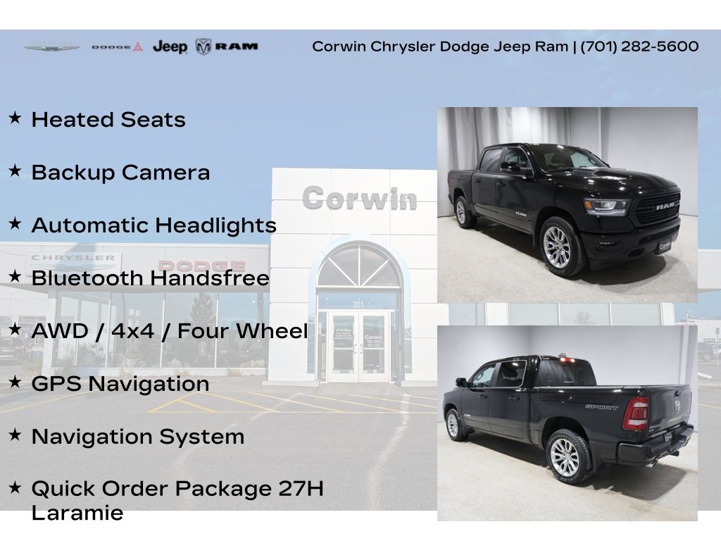 This Ram 1500 is well equipped and includes these key features and benefits, Heated Seats, Backup Camera, Automatic Headlights, Bluetooth Handsfree, AWD / 4x4 / Four Wheel, 12" Touchscreen Display, 2nd Row In Floor Storage Bins, 4G LTE Wi-Fi Hot Spot, Apple CarPlay, Auto High Beam Headlamp Control, Black Interior Accents, Blind Spot & Cross Path Detection, Body Color Exterior Mirrors, Body Color Front Bumper, Body Color Premium Power Mirrors, Body Color Rear Bumper w/Step Pads, Connected Travel & Traffic Services, Connectivity - US/Canada, Disassociated Touchscreen Display, Electric Shift-On-Demand Transfer Case, Foam Bottle Insert (Door Trim Panel), For Details, Visit DriveUconnect.com, For More Info, Call 800-643-2112, Front Door Accent Lighting, Front LED Fog Lamps, Global Telematics Box Module (TBM), Google Android Auto, GPS Antenna Input, GPS Navigation, Grille Surround 3 Body Color Tex 2 Black, HD Radio, Integrated Center Stack Radio, Integrated Voice Command w/Bluetooth, Laramie Level 1 Equipment Group, LED Reflector Headlamps, Navigation System, ParkSense Front/Rear Park Assist w/Stop, Quick Order Package 27H Laramie, Radio: Uconnect 5 Nav w/12.0" Display, Rain Sensitive Windshield Wipers, RAM Grille Badge - Chrome, Rear Door Accent Lighting, Rear Power Sliding Window, Rear Window Defroster, Remote Tailgate Release, SiriusXM Radio Service, SiriusXM w/360L, Sport Appearance Package, Sport Decal, Sport Performance Hood, USB Host Flip, Wheels: 20" x 9" Premium Painted w/Inserts. Odometer is 16193 miles below market average!