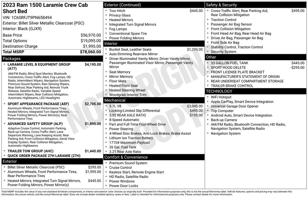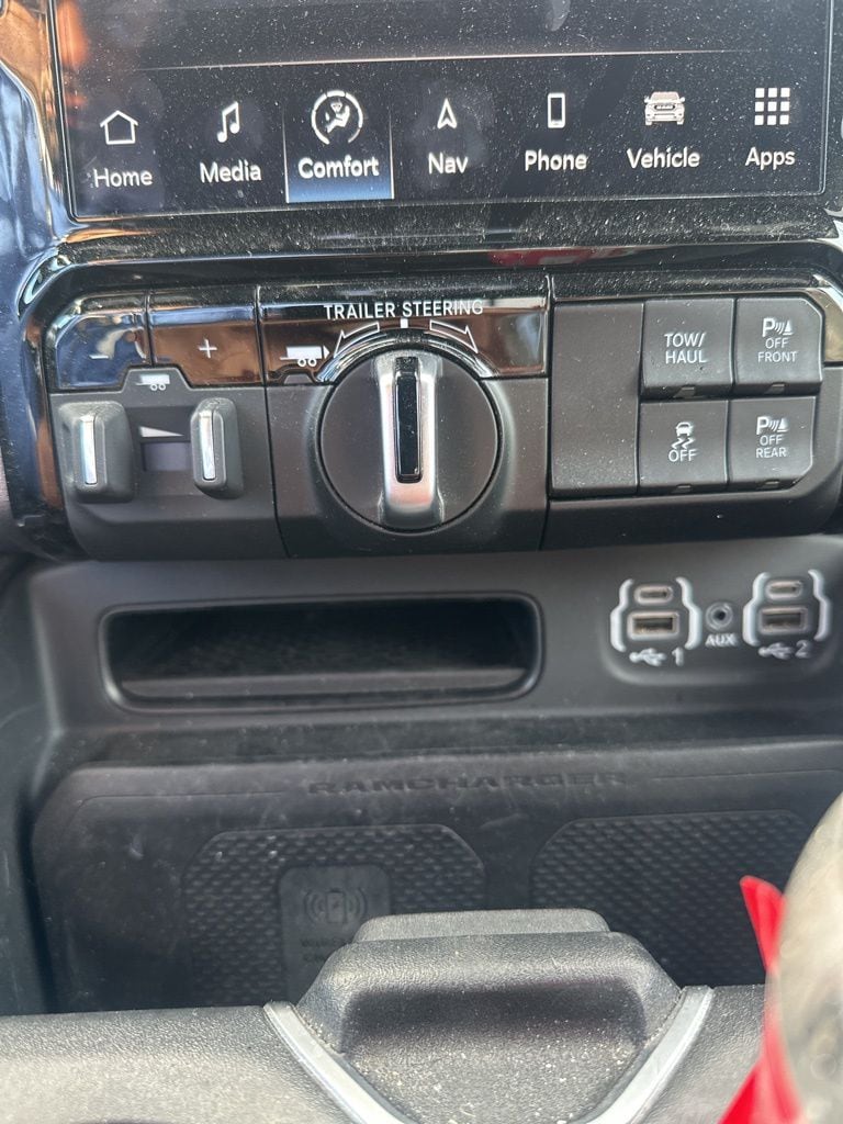 This Ram 1500 is well equipped and includes these key features and benefits, Heated and Cooled Seats, Navigation System, Touchscreen Controls, Backup Camera, Automatic Headlights, Bluetooth Handsfree, AWD / 4x4 / Four Wheel, 12" Touchscreen Display, 2nd Row In Floor Storage Bins, 4G LTE Wi-Fi Hot Spot, Adaptive Cruise Control w/Stop & Go, Advanced Safety Group, Apple CarPlay, Auto High Beam Headlamp Control, Black Interior Accents, Blind Spot & Cross Path Detection, Body Color Exterior Mirrors, Body Color Front Bumper, Body Color Premium Power Mirrors, Body Color Rear Bumper w/Step Pads, Connected Travel & Traffic Services, Connectivity - US/Canada, Disassociated Touchscreen Display, Electric Shift-On-Demand Transfer Case, Foam Bottle Insert (Door Trim Panel), For Details, Visit DriveUconnect.com, For More Info, Call 800-643-2112, Front Door Accent Lighting, Front LED Fog Lamps, Global Telematics Box Module (TBM), Google Android Auto, GPS Antenna Input, GPS Navigation, Grille Surround 3 Body Color Tex 2 Black, harman/kardon 19 Speaker Premium Sound, HD Radio, Heated front seats, Integrated Center Stack Radio, Integrated Voice Command w/Bluetooth, Lane Keep Assist, Laramie Level B Equipment Group, LED Reflector Headlamps, Navigation System, Parallel & Perp Park Assist w/Stop, ParkSense Front/Rear Park Assist w/Stop, Pedestrian Emergency Braking, Quick Order Package 27H Laramie, Radio: Uconnect 5 Nav w/12.0" Display, Rain Sensitive Windshield Wipers, RAM Grille Badge - Chrome, Rear Door Accent Lighting, Rear Power Sliding Window, Rear Underseat Compartment Storage, Rear Window Defroster, Remote Tailgate Release, SiriusXM Radio Service, SiriusXM w/360L, Sport Appearance Package, Sport Decal, Sport Performance Hood, Surround View Camera System, Tailgate Ajar Warning Lamp, Trailer Brake Control, Trailer Light Check, Trailer Reverse Steering Control, Trailer Tire Pressure Monitoring System, Trailer Tow Group, USB Host Flip, Ventilated Front Seats, Wheels: 20" x 9" Premium Painted w/Inserts. Odometer is 3975 miles below market average!