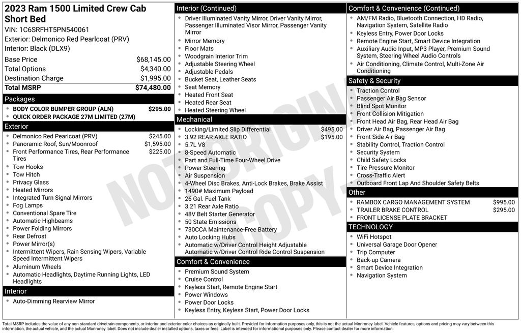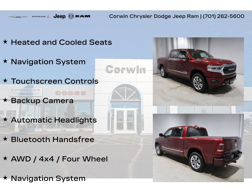 This Ram 1500 is well equipped and includes these key features and benefits, Heated and Cooled Seats, Navigation System, Touchscreen Controls, Backup Camera, Automatic Headlights, Bluetooth Handsfree, AWD / 4x4 / Four Wheel, Body Color Bumper Group, Body Color Front Bumper, Body Color Rear Bumper w/Step Pads, Dome Dual LED Reading Lamp, Dual Rear Exhaust w/Bright Tips, Dual-Pane Panoramic Sunroof, Heated front seats, LED Dome/Reading Lamp, Navigation System, Quick Order Package 27M Limited, Ventilated Front Seats.