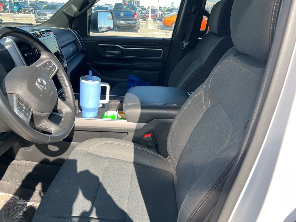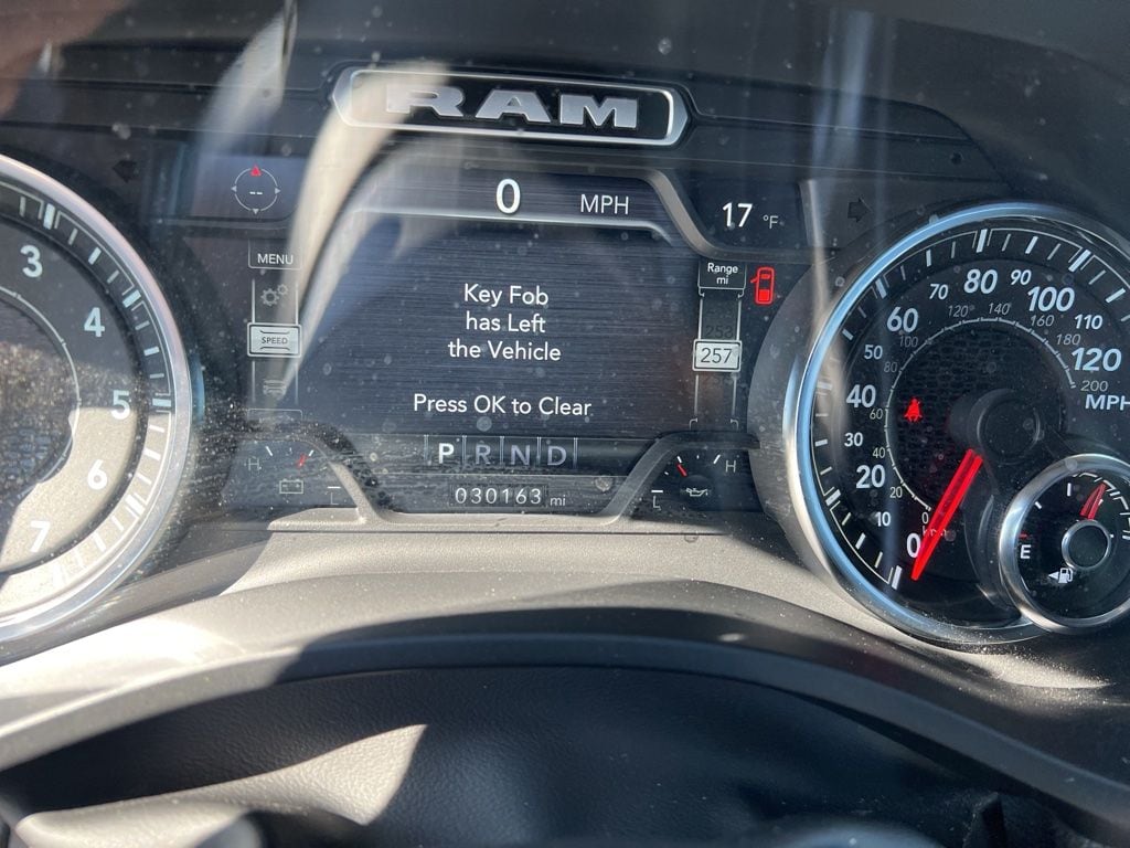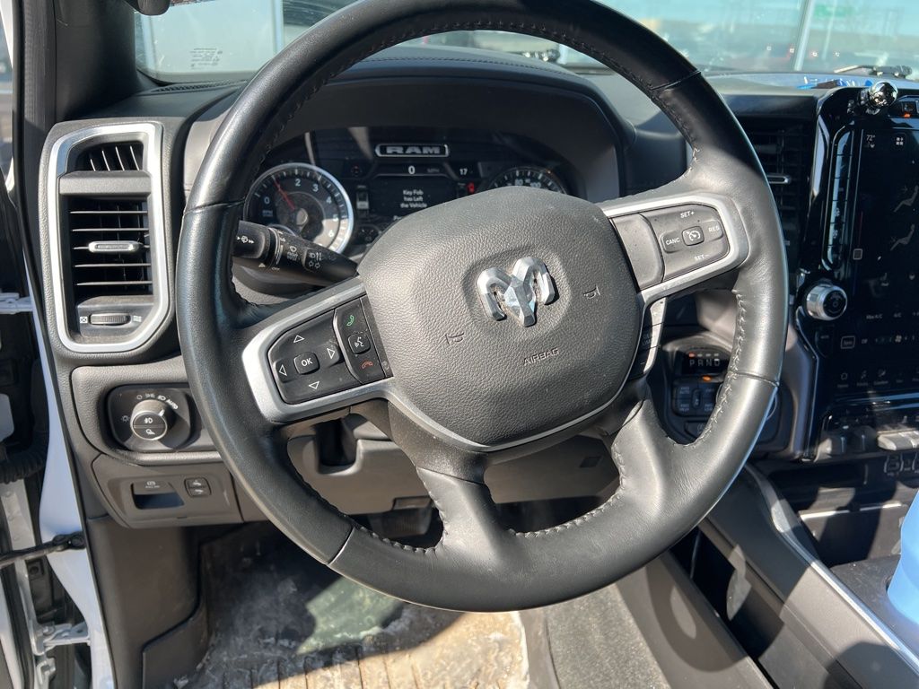 This Ram 1500 is well equipped and includes these key features and benefits, AWD / 4x4 / Four Wheel, Local Trade, 115V Auxiliary Power Outlet, 2nd Row In Floor Storage Bins, 400W Inverter, 9 Amplified Speakers w/Subwoofer, Advanced Brake Assist, Air Conditioning ATC w/Dual Zone Control, Auto-Dimming Exterior Driver Mirror, Auto-Dimming Rear-View Mirror, Big Horn Badge, Big Horn Level B Equipment Group, Black Exterior Mirrors, Black Interior Accents, Black Premium Power Mirrors, Body Color Door Handles, Body Color Exterior Mirrors, Body Color Front Bumper, Body Color Premium Power Mirrors, Body Color Rear Bumper w/Step Pads, Class IV Receiver Hitch, Cluster 7.0" TFT Color Display, Convex Wide-Angle Exterior Mirror Insert, Deluxe Cloth Bucket Seats, Digital Rearview Mirror, Exterior Mirrors Courtesy Lamps, Exterior Mirrors w/Heating Element, Exterior Mirrors w/Supplemental Signals, Front Fog Lamps, Front LED Fog Lamps, Full Speed Forward Collision Warning Plus, Global Telematics Box Module (TBM), Glove Box Lamp, GPS Navigation, Heads-Up Display, Heated Front Seats, Heated Steering Wheel, Lane Keep Assist, LED CHMSL Lamp, LED Footwell Lighting, LED Reflector Headlamps, LED Taillamps, Level 1 Safety Group, Media Hub w/2 Charge Only USBs, ParkSense Front/Rear Park Assist w/Stop, Pedestrian Emergency Braking, Power 2-Way Driver Lumbar Adjust, Power 8-Way Driver Seat, Power Adjustable Pedals, Power-Folding Mirrors, Premium Lighting Group, Quick Order Package 23Z Big Horn, Radio: Uconnect 5 Nav w/12.0" Display, RAM Grille Badge - Chrome, Rear Dome w/On/Off Switch Lamp, Rear Power Sliding Window, Rear Window Defroster, Remote Start System, Security Alarm, SiriusXM Radio Service, SiriusXM Satellite Radio, Sport Appearance Package, Sport Decal, Sun Visors w/Illuminated Vanity Mirrors, Technology Group, Universal Garage Door Opener. Odometer is 4713 miles below market average!