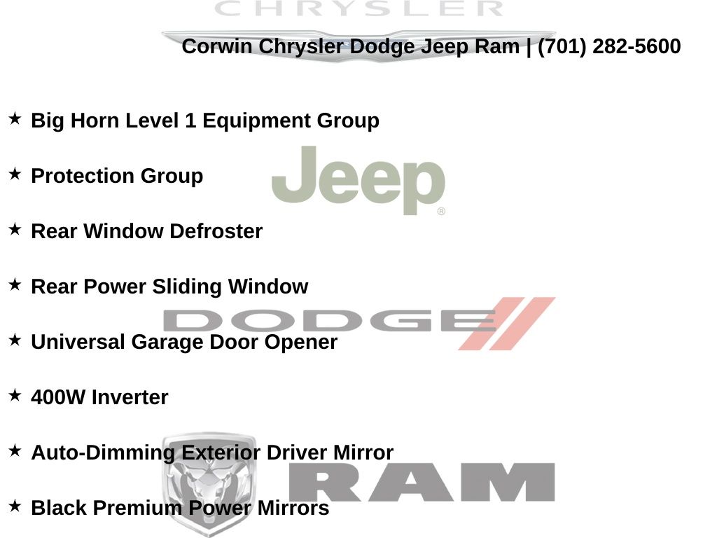 This Ram 1500 is well equipped and includes these key features and benefits, Heated Seats, Touchscreen Controls, Backup Camera, Automatic Headlights, Bluetooth Handsfree, One Owner, AWD / 4x4 / Four Wheel, 115V Auxiliary Power Outlet, 2nd Row In Floor Storage Bins, 400W Inverter, Auto Power-Folding Mirrors, Auto-Dimming Exterior Driver Mirror, Auto-Dimming Rear-View Mirror, Big Horn Badge, Big Horn Level 1 Equipment Group, Black Exterior Mirrors, Black Premium Power Mirrors, Convex Wide-Angle Exterior Mirror Insert, Exterior Mirrors Courtesy Lamps, Exterior Mirrors w/Heating Element, Exterior Mirrors w/Supplemental Signals, Glove Box Lamp, Heated Front Seats, Heated Steering Wheel, Leather Wrapped Steering Wheel, Power 2-Way Driver Lumbar Adjust, Power Adjust 8-Way Driver Seat, Power Adjustable Pedals, Protection Group, Quick Order Package 23Z Big Horn, Rear Power Sliding Window, Rear Window Defroster, Steering Wheel Mounted Audio Controls, Sun Visors w/Illuminated Vanity Mirrors, Tow Hooks, Universal Garage Door Opener.