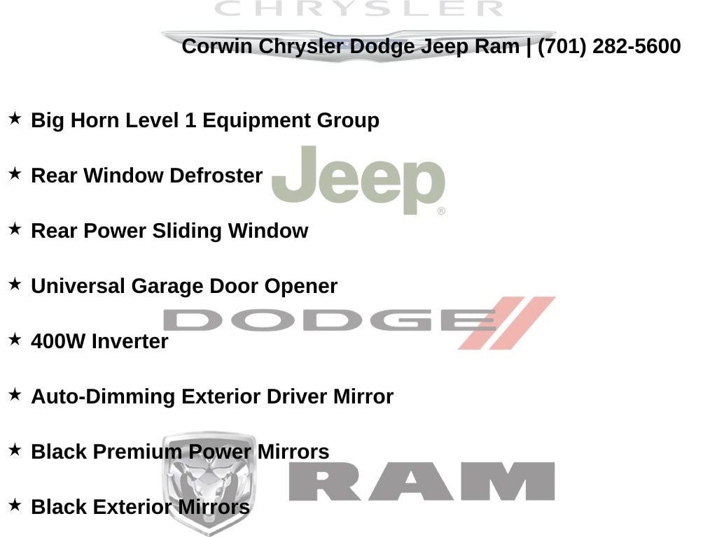 This Ram 1500 is well equipped and includes these key features and benefits, Heated Seats, Touchscreen Controls, Backup Camera, Automatic Headlights, Bluetooth Handsfree, One Owner, AWD / 4x4 / Four Wheel, 115V Auxiliary Power Outlet, 2nd Row In Floor Storage Bins, 400W Inverter, Auto Power-Folding Mirrors, Auto-Dimming Exterior Driver Mirror, Auto-Dimming Rear-View Mirror, Big Horn Level 1 Equipment Group, Black Exterior Mirrors, Black Premium Power Mirrors, Convex Wide-Angle Exterior Mirror Insert, Exterior Mirrors Courtesy Lamps, Exterior Mirrors w/Heating Element, Exterior Mirrors w/Supplemental Signals, Glove Box Lamp, Heated Front Seats, Heated Steering Wheel, Leather Wrapped Steering Wheel, Power 2-Way Driver Lumbar Adjust, Power Adjust 8-Way Driver Seat, Power Adjustable Pedals, Quick Order Package 21Z Big Horn, Rear Power Sliding Window, Rear Window Defroster, Steering Wheel Mounted Audio Controls, Sun Visors w/Illuminated Vanity Mirrors, Universal Garage Door Opener. Odometer is 6515 miles below market average!
