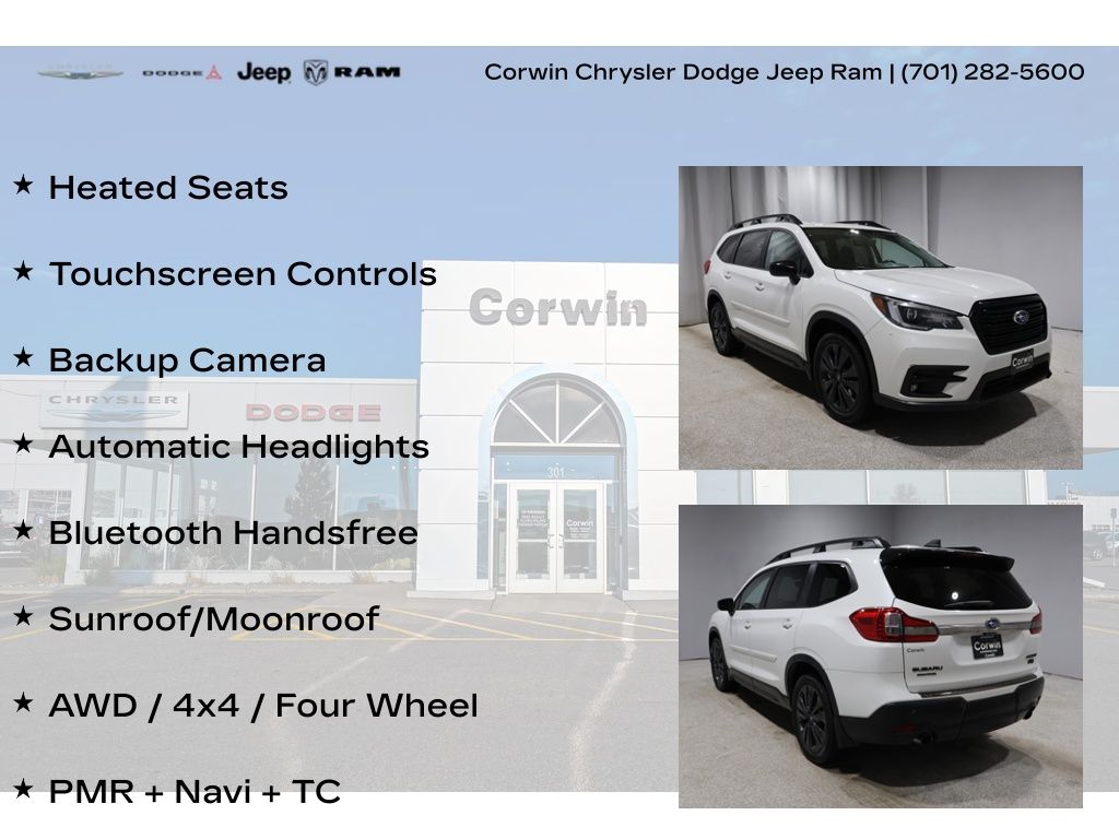 This Subaru Ascent is well equipped and includes these key features and benefits, Heated Seats, Touchscreen Controls, Backup Camera, Automatic Headlights, Bluetooth Handsfree, Sunroof/Moonroof, AWD / 4x4 / Four Wheel, 3rd row seats: bench, Cargo Area Cover, Dual Glass Panoramic Power Moonroof, Heated front seats, PMR + Navi + TC, Radio: Subaru STARLINK 8.0" Multimedia Nav System. 20/26 City/Highway MPG