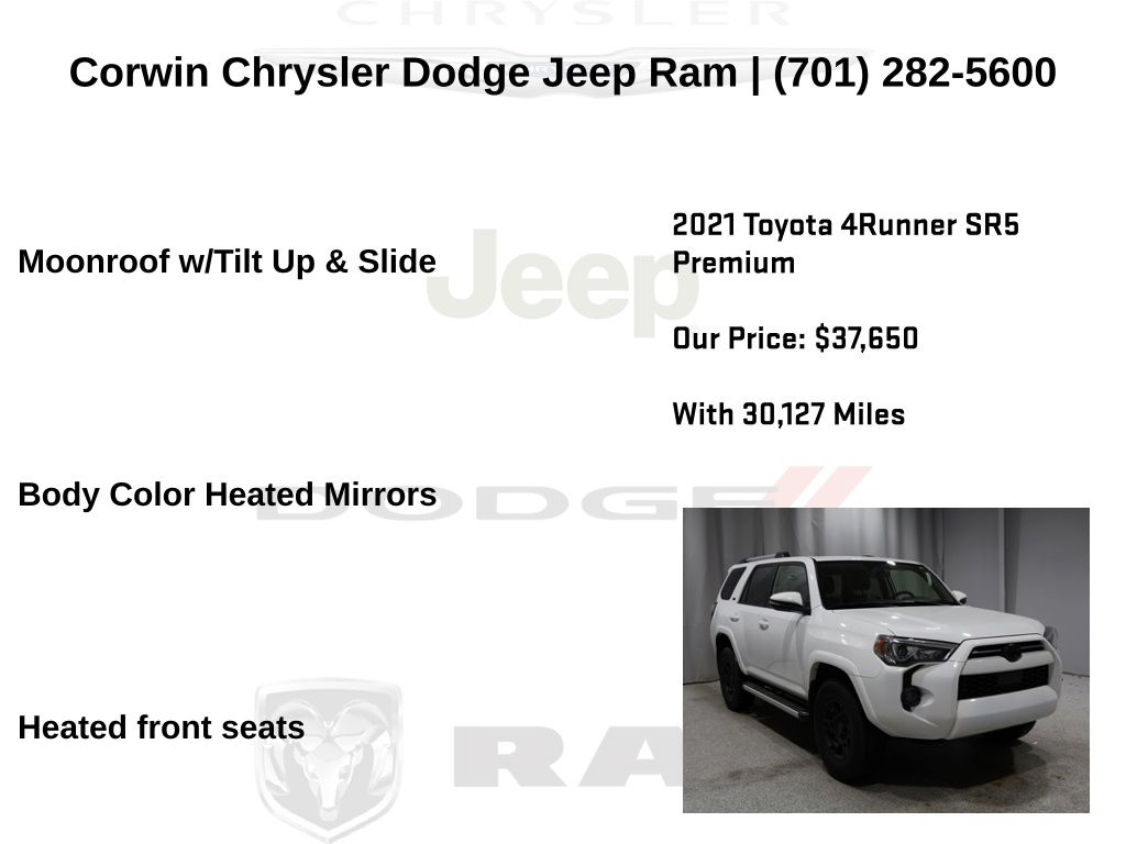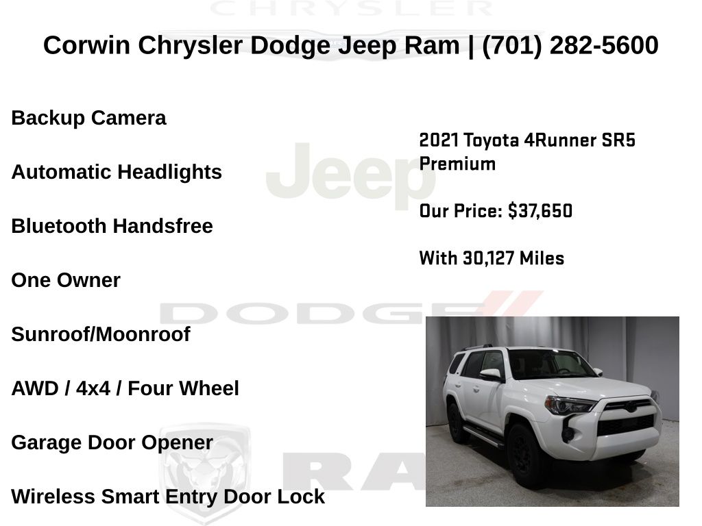 WELCOME TO DECEMBER AT CORWIN CHRYSLER DODGE JEEP RAM OF FARGO!! WE HAVE GREAT SAVINGS ON ALL OF OUR PRE-OWNED VEHICLES AVAILABLE!! WE HAVE ONE OF THE LARGEST SELECTIONS OF INVENTORIES IN OUR AREA AT ONE SINGLE LOCATION!! Priced below KBB Fair Purchase Price! White 2021 Toyota 4Runner SR5 Premium 4D Sport Utility 4WD 4.0L V6 SMPI DOHC CARFAX One-Owner. Clean CARFAX.