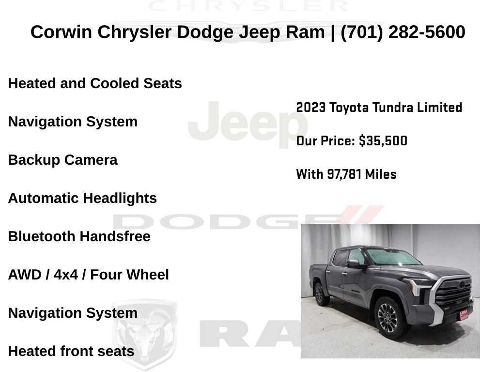 WELCOME TO DECEMBER AT CORWIN CHRYSLER DODGE JEEP RAM OF FARGO!! WE HAVE GREAT SAVINGS ON ALL OF OUR PRE-OWNED VEHICLES AVAILABLE!! WE HAVE ONE OF THE LARGEST SELECTION OF INVENTORIES IN OUR AREA AT ONE SINGLE LOCATION!! Priced below KBB Fair Purchase Price! Black 2023 Toyota Tundra Limited 4D CrewMax 4WD 3.4L V6 CARFAX One-Owner.
