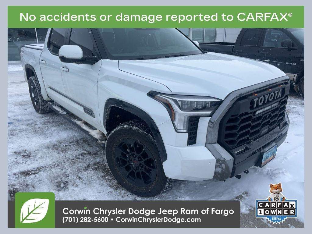 WELCOME TO DECEMBER AT CORWIN CHRYSLER DODGE JEEP RAM OF FARGO!! WE HAVE GREAT SAVINGS ON ALL OF OUR PRE-OWNED VEHICLES AVAILABLE!! WE HAVE ONE OF THE LARGEST SELECTION OF INVENTORIES IN OUR AREA AT ONE SINGLE LOCATION!! Recent Arrival! Priced below KBB Fair Purchase Price! White 2025 Toyota Tundra Platinum 4D CrewMax 4WD 3.4L V6 CARFAX One-Owner.